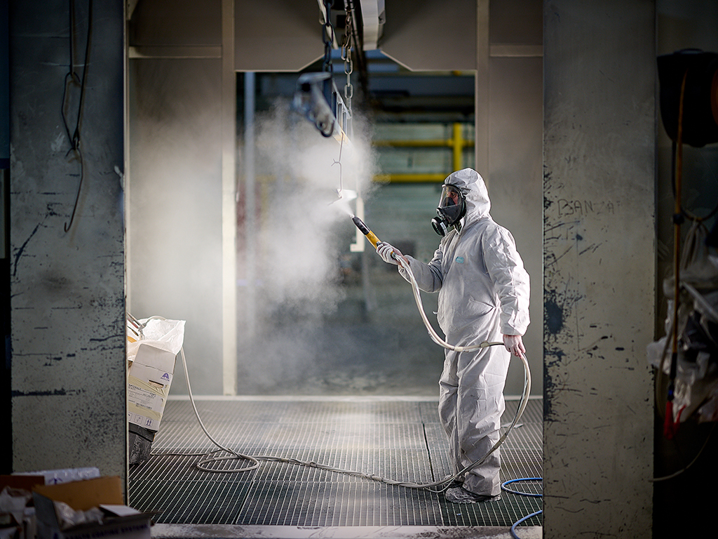 Projection de peinture en poudre sur des éléments métalliques, avant cuisson pour fixer la matière. Nous disposons d'une cabine de thermolaquage de 7 mètres de longueur et 2m40 de hauteur, et d'un four de 11 mètres de longueur et 2m40 de hauteur.